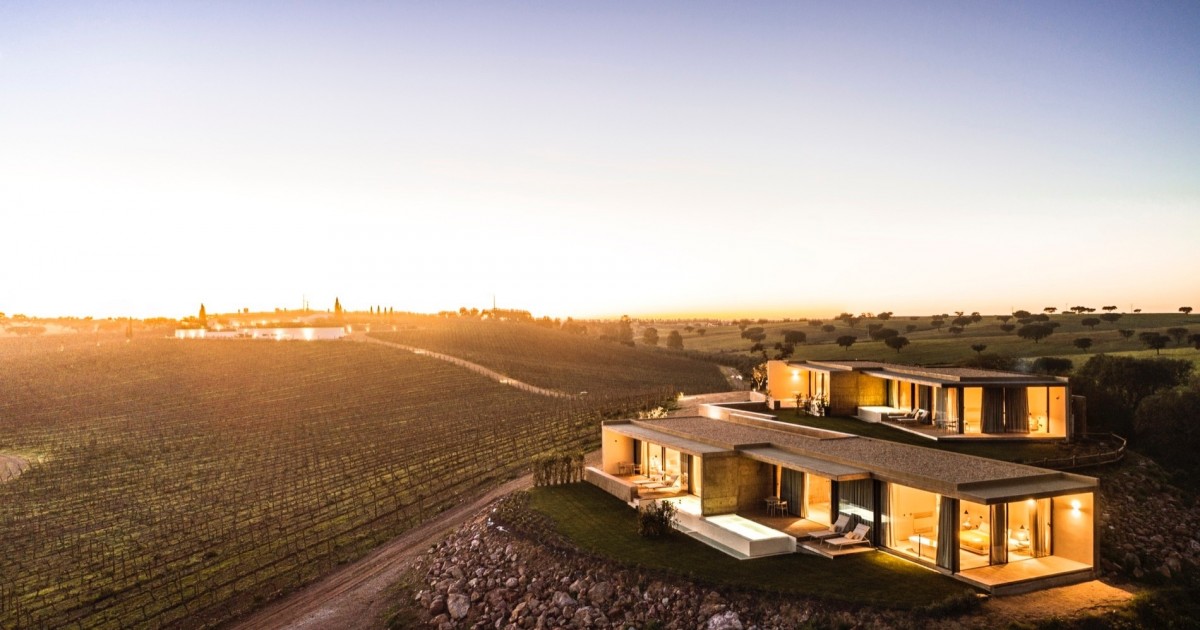 The gold-coloured floor extends the colour of the soil inside this refuge immersed in the vines of Peceguina, surrounded by the aromas of wine and with a view of Ribeira de Terges, once a navigable waterway.